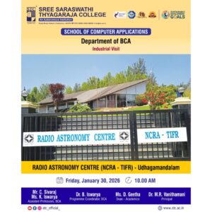 Sree Saraswathi Thyagaraja College (STC) is committed to delivering quality education and holistic development. Located in Pollachi, Tamil Nadu, we offer a range of undergraduate and postgraduate programs. Accredited by Bharathiar University and ISO-certified, we strive for academic excellence. Join us to build a brighter future together.