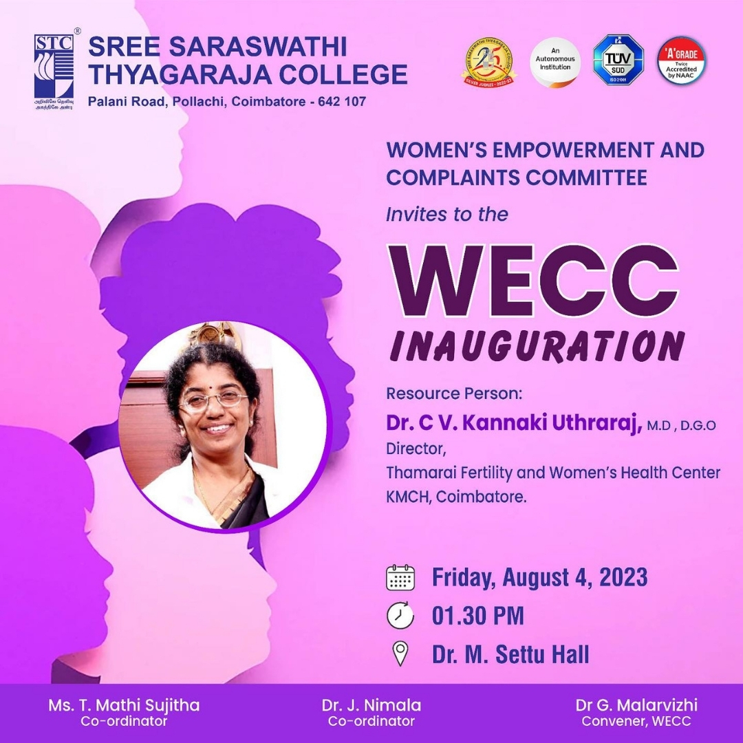 Sree Saraswathi Thyagaraja College (STC) is committed to delivering quality education and holistic development. Located in Pollachi, Tamil Nadu, we offer a range of undergraduate and postgraduate programs. Accredited by Bharathiar University and ISO-certified, we strive for academic excellence. Join us to build a brighter future together.